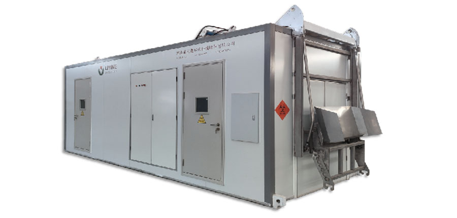 The infectious material is temporarily held in a waste container(s) which in turn, are emptied into an pre storage hopper via a charging system which is located at the front of the MDU, The infectious waste is fed to the shredding system by a feed arm where it is shredded. The shredded material is conveyed through a microwave section and temperature holding section, respectively for sterilization, with microwave of 2450MHz (±50MHz), temperature ≥95℃, with over 45 minutes. The sterilized and unrecognizable (sharps) waste is then discharged into large waste containers (or compaction units) by the discharging screw conveyor. From there the material can be transported to a local municipal landfill for disposal or to a refuse recycling plant.
